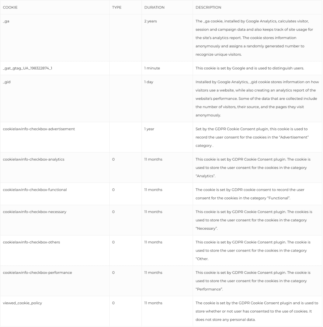 Below is a list of cookies associated with Google Analytics that can be used on this Site from time to time: