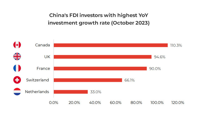 In terms of investors, the paid-in investment of Canada, the UK, France, Switzerland and the Netherlands in China increased by 110.3%, 94.6%, 90.0%, 66.1% and 33.0%, respectively.