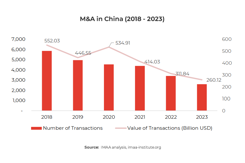 China M&A activity has been on the decline for three years in a row, however, it still accounted for 41% of deals in the Asia-Pacific region in the first half of 2023, according to S&P Global. The world’s second-largest economy recorded 2,601 deals in 2023, with a combined value of 260.12 billion USD. This was an eight-year low in terms of deal volume, and a fourth straight year of decline in volume.