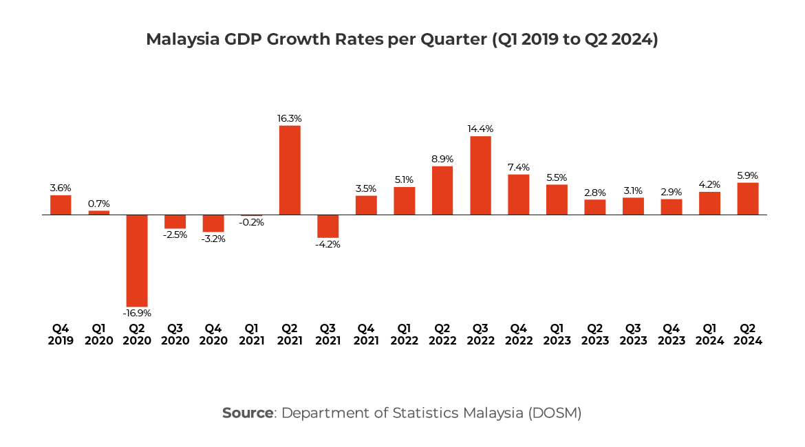 The country’s gross domestic product (GDP) registered a year-on-year (YOY) growth of 5.9%, amounting to RM400.7 billion. This growth not only exceeded both the government’s expectations and the Bloomberg consensus median forecast of 5.8%, but it also represents the highest YOY growth rate since the first quarter of 2023. Furthermore, on a quarter-on-quarter basis, GDP for Q2 2024 increased by 2.9%, marking the most robust quarterly growth since the third quarter of 2022.