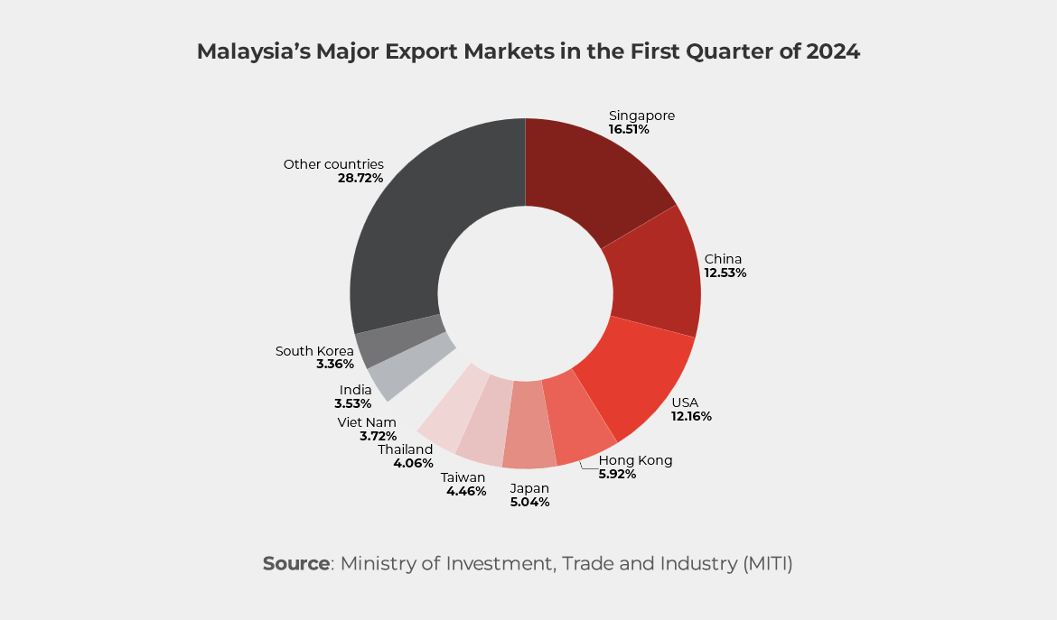 - China: Trade with China expanded by 8.9% to RM234.09 billion in the first half of 2024 compared to the corresponding period in 2023. Exports to China fell slightly by 1.1% to RM90.7 billion due to lower exports of Electrical and Electronic Products, but this was offset by higher exports of paper and pulp products, LNG, and metal manufactures. Imports from China increased by 16.5% to RM143.39 billion.