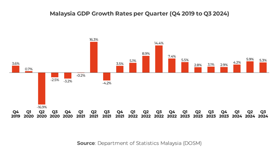 Malaysia’s GDP grew by 5.3% year-on-year in the third quarter of 2024, driven by robust investment activity, steady export performance, and resilient household spending.