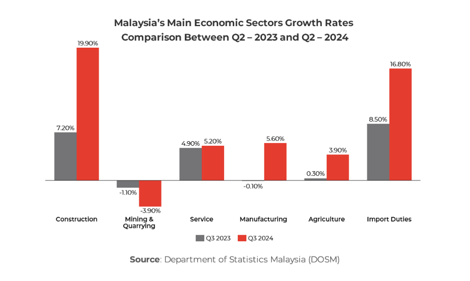 Malaysia’s economy demonstrated resilience in the third quarter of 2024, with key indicators reflecting continued growth, supported by strong investment activity and improved export performance. According to the Department of Statistics Malaysia (DOSM), the gross domestic product (GDP) grew by 5.3% year-on-year (YoY), reaching RM419.2 billion. This aligns with consensus forecasts by Reuters, which had projected a 5.3% growth rate for the July-to-September period, albeit moderating from 5.9% growth in Q2 2024. On a quarter-on-quarter (QoQ), seasonally adjusted basis, growth momentum moderated to 1.8% compared to 2.9% in the previous quarter. Overall, the Malaysian economy expanded by 5.2% during the first three quarters of 2024.