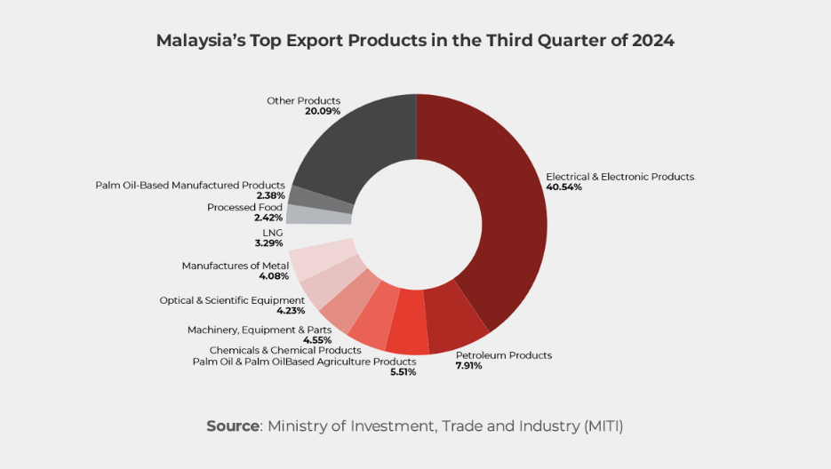 - China: Trade with China grew by 9% to RM355.2 billion. However, exports to China declined by 1.9% to RM137.1 billion, primarily due to reduced demand for E&E products and chemicals. Imports from China increased significantly by 17.2% to RM218.1 billion, reflecting strong demand for industrial inputs.
