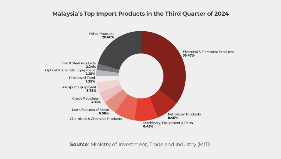 On the import side, Malaysia’s total import value for Q3 2024 stood at RM359.0 billion, marking a substantial YoY growth of 20.8% and a QoQ increase of 6.6%. Major imported products included E&E Products, Petroleum Products, and Machinery, Equipment & Parts. Among these, the fastest-growing import categories were E&E Products (+43% YoY), Machinery, Equipment & Parts (+32.6% YoY), and Processed Food (+16.1% YoY). Malaysia’s top import partners during this period were China, Singapore, and the United States, reflecting robust trade ties with these economies.