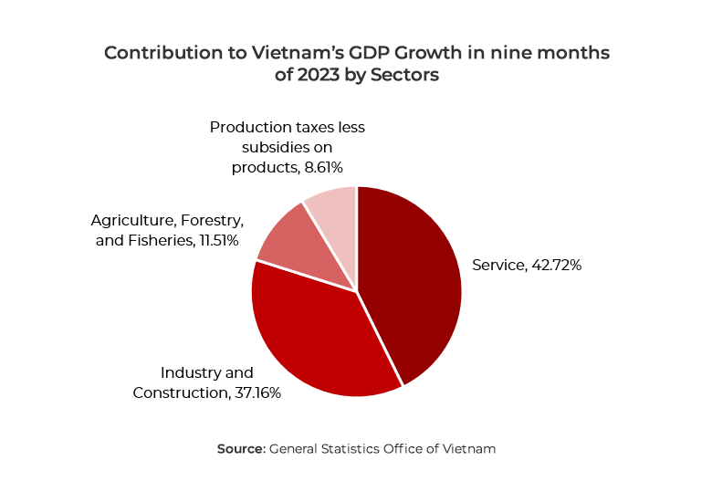 Thirdly, the diverse economic structure of Vietnam is another indicator of its attractiveness. During the first nine months of 2023, the service sector accounts for 42.72% of Vietnam’s GDP, followed by industry and construction (37.16%), agriculture, forestry, and fishery (11.51%), and product taxes less all subsidies (8.61%). The country’s robust economic growth explains its attraction to foreign investors. One valuable highlight is that thanks to the electric vehicle (EV) manufacturer VinFast, Vietnam became the world’s third-largest automaker by market capitalization in 2023. This not only indicate a promising future for the EV industry in Southeast Asia overall but also exemplifies Vietnam’s emerging manufacturing capability.