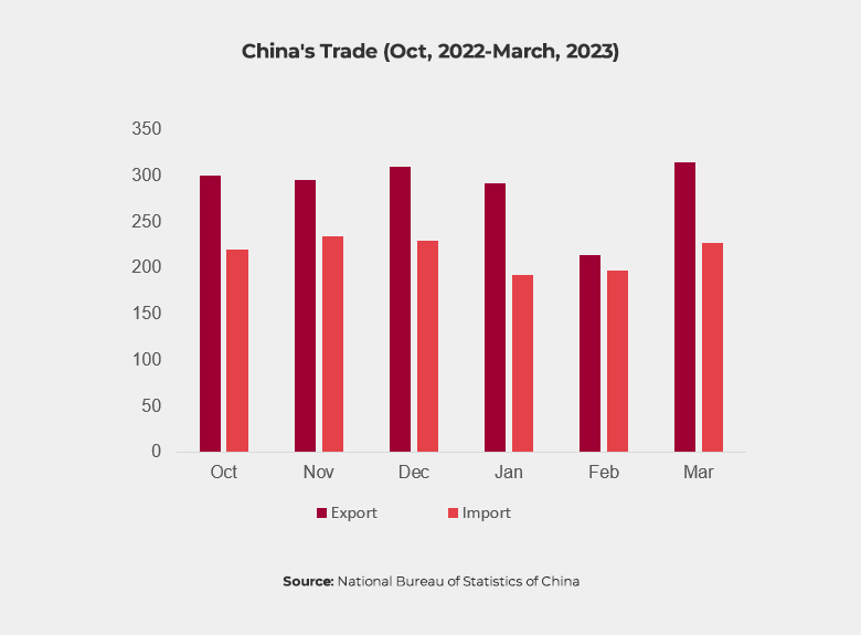 From January to February 2023, China’s imports decreased by 2.37% when compared with the same period the previous year. Import growth slowed due to the slowed output during China’s spring festival celebrations and the volatility of commodity prices. The surprise export growth in Q1 was largely attributed to a surge in demand from Southeast Asia and countries along the Belt and Road Initiatives (BRI).