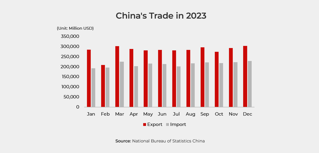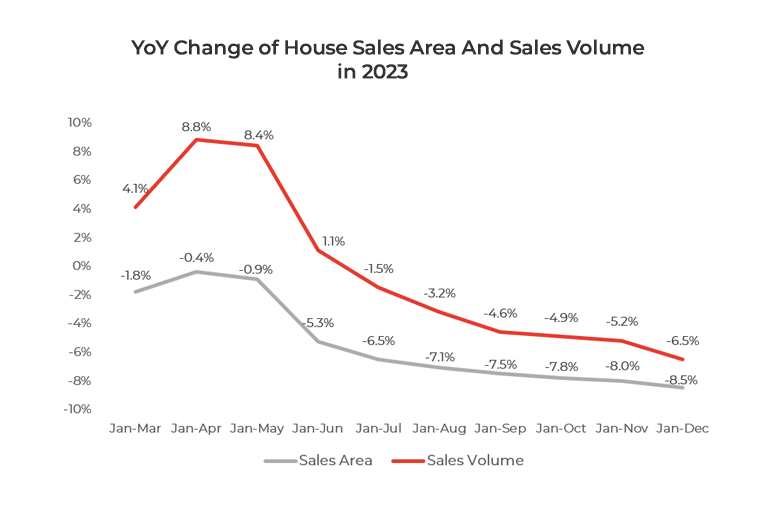 Despite the relaxation of policies in China’s real estate industry, domestic housing demand remained sluggish in 2023. During the twelve months, the total value and floor space of new homes sold decreased by 6.5% and 8.5%, respectively, compared to 2022. A similar situation was observed in the commercial housing market, with the sales volume declining to 16 billion USD, down by 6.5% year-on-year.