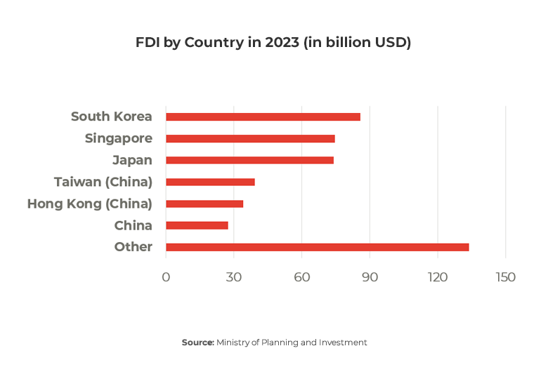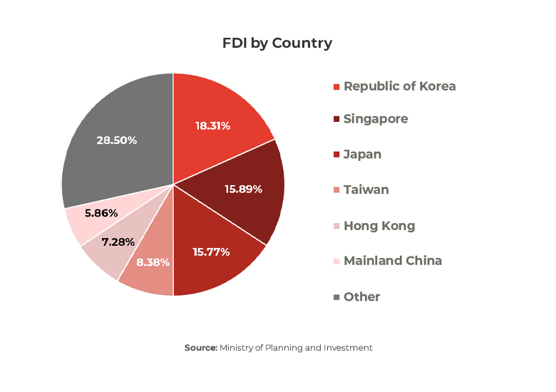The main contributors of Vietnam FDI continue to be neighboring economies. Republic of Korea, Singapore and Japan are the biggest investors, followed by Taiwan, Hong Kong, and Mainland China. The sustained influx of FDI is underpinned by Vietnam’s comprehensive FTAs, as major contributors to FDI maintain such agreements with Vietnam.