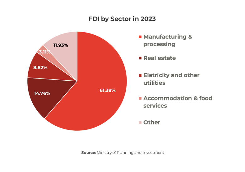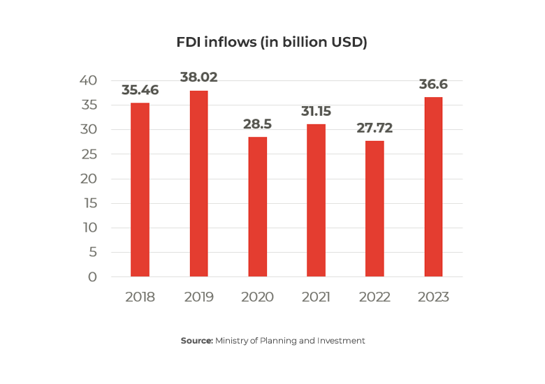 Vietnam experienced a remarkable rise in registered FDI inflows in 2023 with a total of 36.6 billion USD, 32.1% increase YoY according to the Foreign Investment Agency (FIA) of the Ministry of Planning and Investment (MPI), with disbursement of 23.18 billion USD. The upturn is believed to be derived from the stabilization and reduction of inflation and interest rates in key sources of FDI. The relaxation of Covid-restrictions has been an additional supporting factor in the increase of FDI inflow.