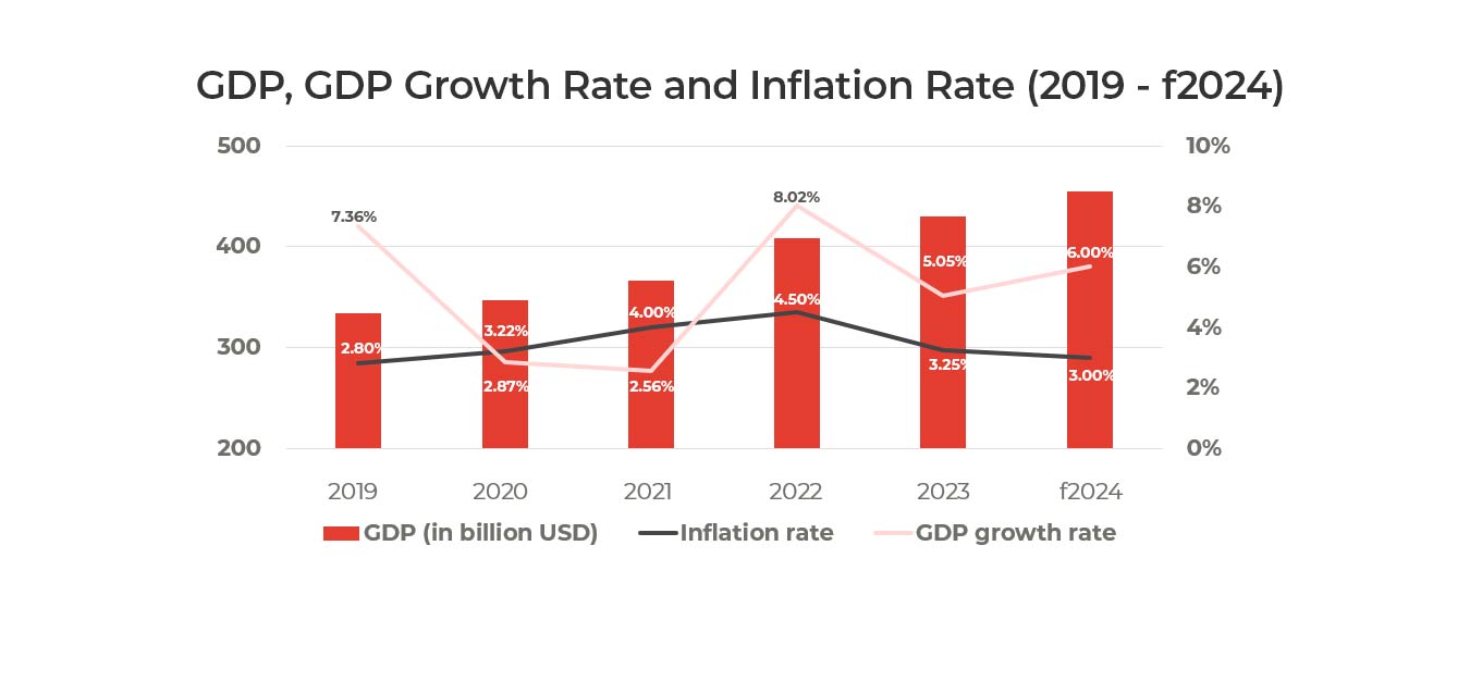 Vietnam’s Consumer Price Index grew by 3.25% for 2023, which is a slowdown in inflation rates from previous years, with a high point in 2022 at 4.5%. The lower inflation rate in 2023 suggests a trend toward a more stable economic environment.