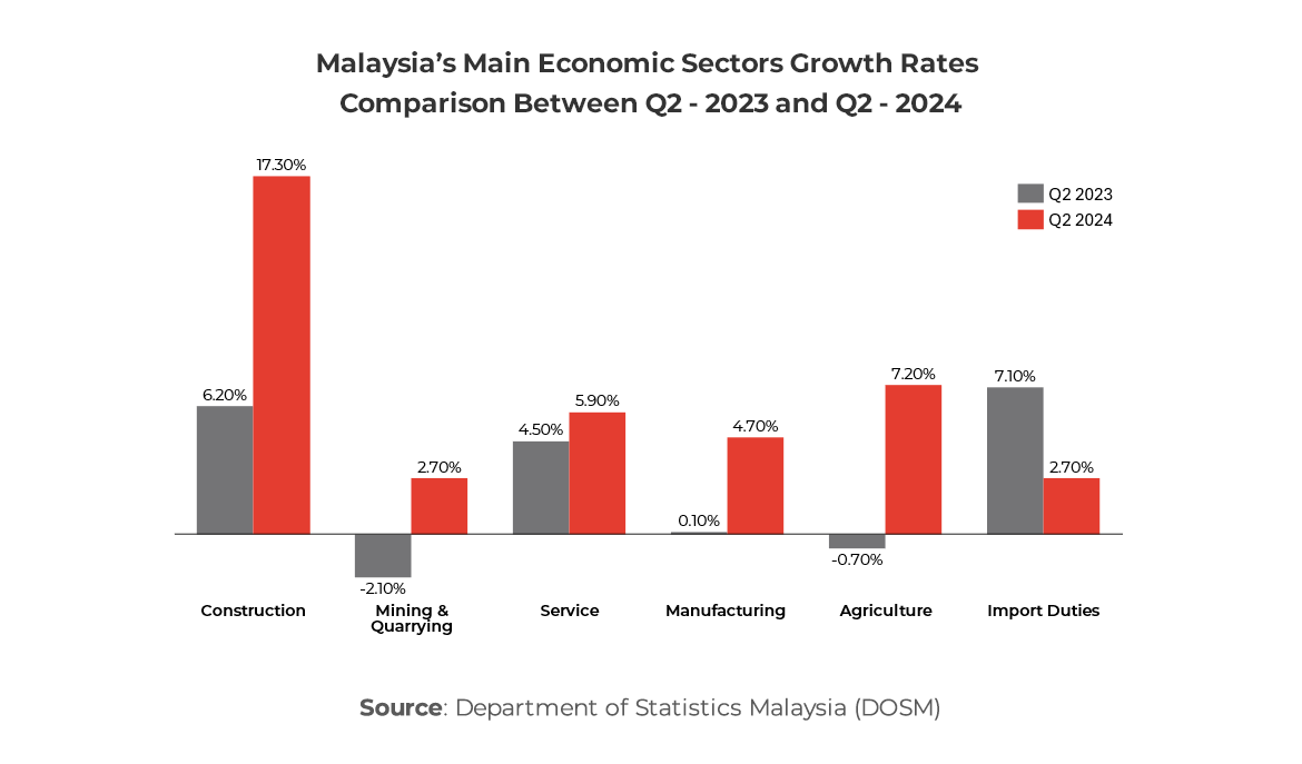 The country’s gross domestic product (GDP) registered a year-on-year (YOY) growth of 5.9%, amounting to RM400.7 billion. This growth not only exceeded both the government’s expectations and the Bloomberg consensus median forecast of 5.8%, but it also represents the highest YOY growth rate since the first quarter of 2023. Furthermore, on a quarter-on-quarter basis, GDP for Q2 2024 increased by 2.9%, marking the most robust quarterly growth since the third quarter of 2022.