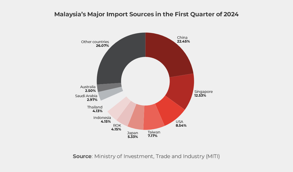 On the import front, Malaysia recorded RM336.79 billion in Q2 2024, marking a substantial year-on-year growth of 15% and a quarter-on-quarter increase of 2.6%. Key import products included Electrical and Electronic Products, Petroleum Products, and Machinery, Equipment, and Parts, with the latter experiencing the highest year-on-year growth at 36.5%. The leading sources of Malaysia’s imports during this period were China, Singapore, and the United States. This surge is largely driven by Malaysia’s accelerated push towards advanced manufacturing and infrastructure development, requiring sophisticated machinery and technology. Additionally, the country’s commitment to enhancing its technological capabilities, particularly in sectors like electronics and automotive manufacturing, has fueled the demand for cutting-edge machinery and equipment. These imports are crucial for supporting Malaysia’s broader economic strategy to move up the value chain and strengthen its position in the global market.