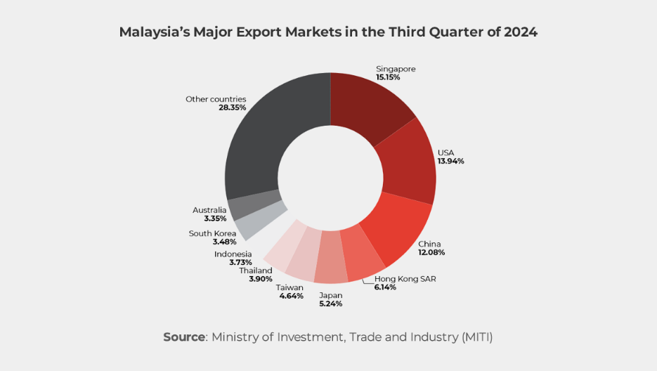 - China: Trade with China grew by 9% to RM355.2 billion. However, exports to China declined by 1.9% to RM137.1 billion, primarily due to reduced demand for E&E products and chemicals. Imports from China increased significantly by 17.2% to RM218.1 billion, reflecting strong demand for industrial inputs.